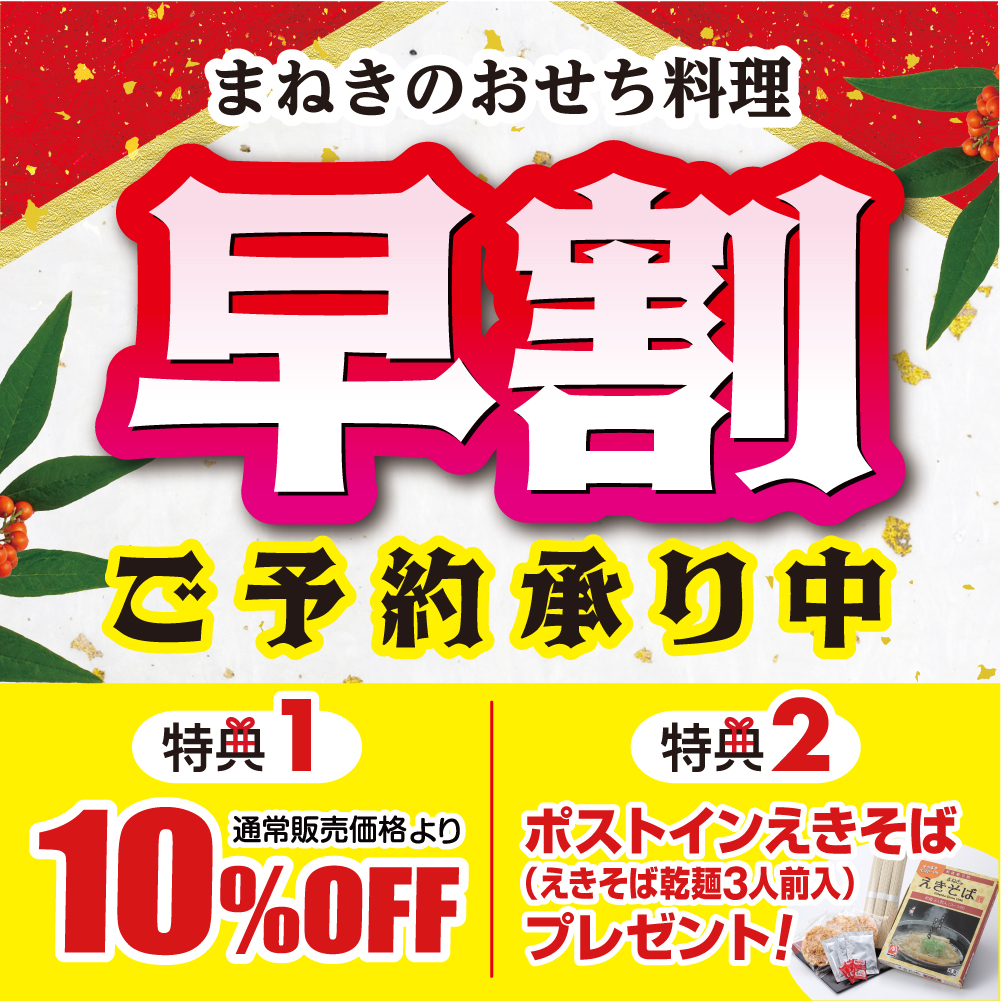 ※ポストインえきそば乾麺につきましては、おせち配達先住所へ別送となります。ポストインタイプのため日時指定は不可。おせち到着日前後に日本郵便(3個以上の場合はヤマト便)にてお届けいたします。