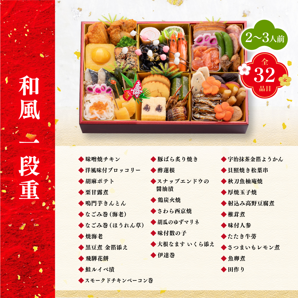 【冷蔵・送料無料】和風一段重おせち|32品目入り|12月31日お届け|2~3人前